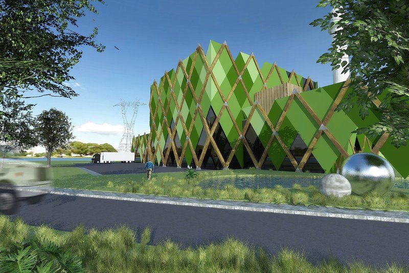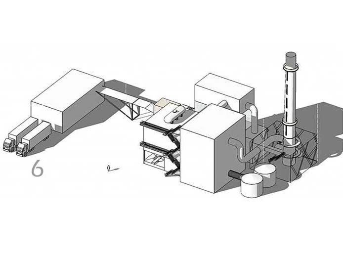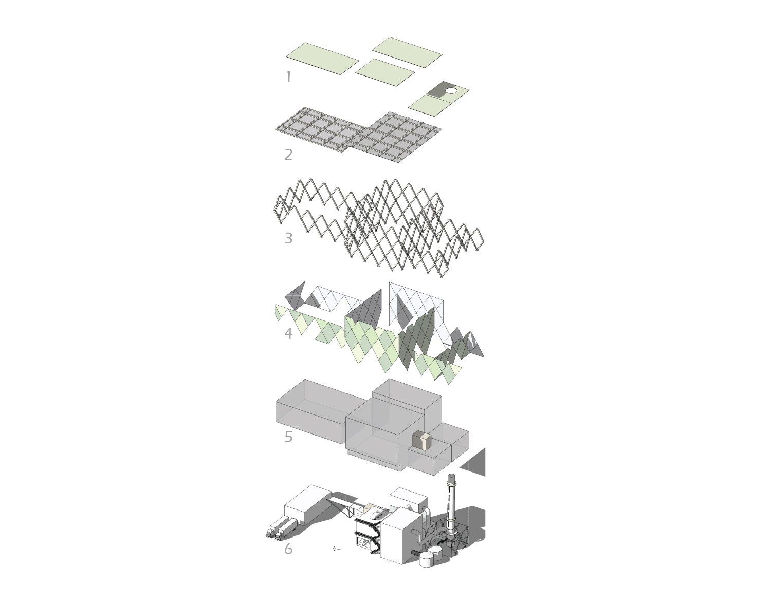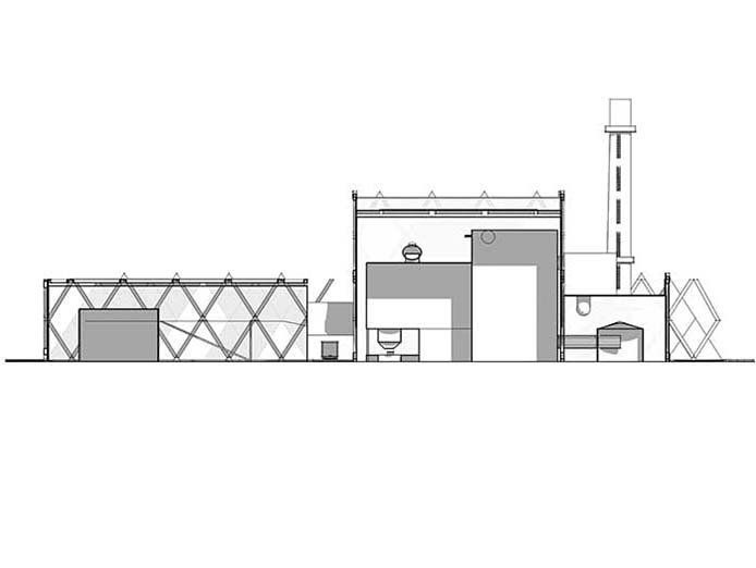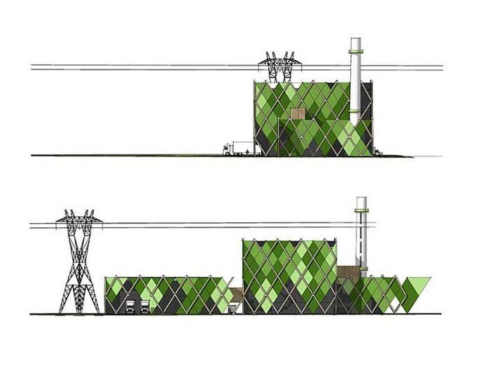 A conceptual scheme to minimise the visual impact of a proposed power station on a green field site with a complex façade system that emulates the surrounding woodland using a glu-lam structure and angled infill panels that avoid vertical and horizontal lines to break up its outline.
