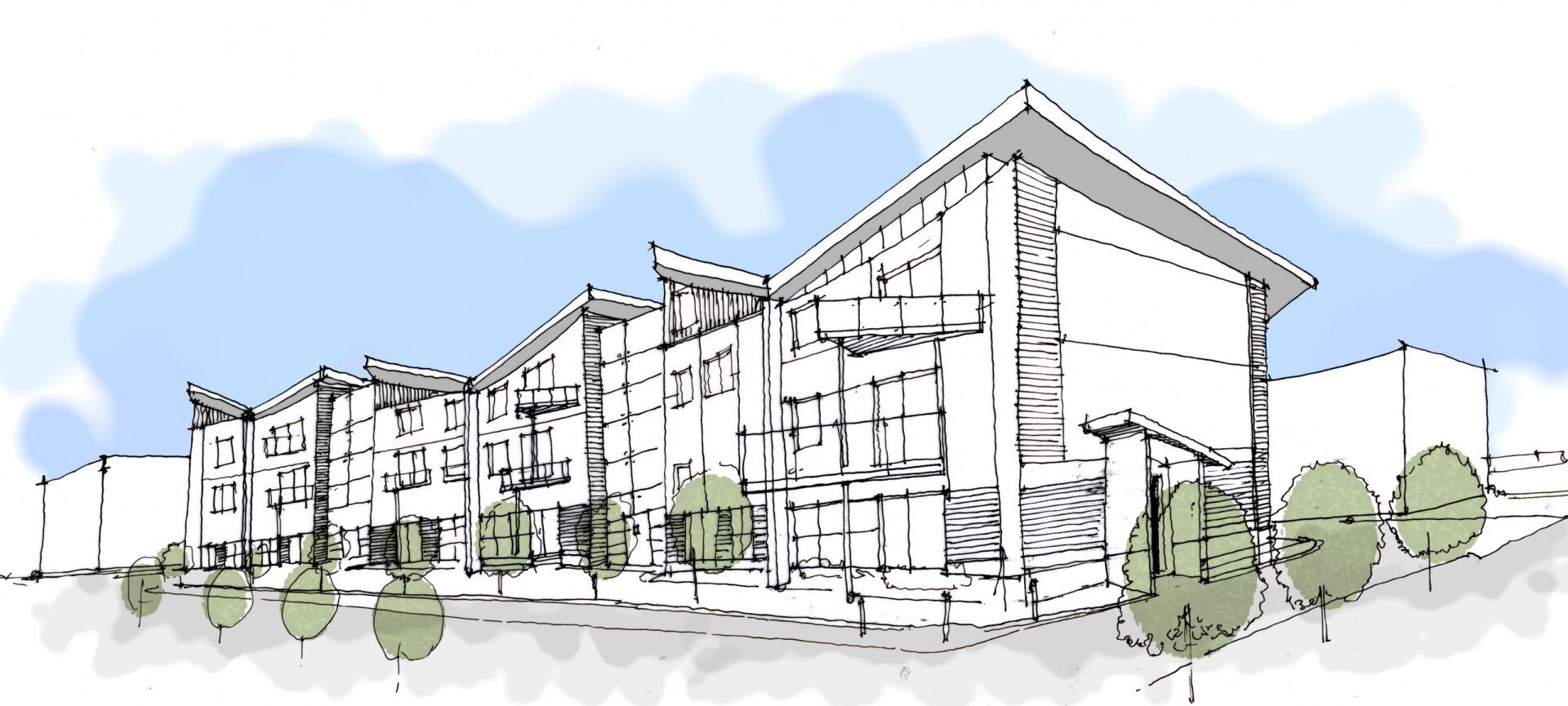 The two respective blocks responded to the curvature of the road, exemplifying a crescent shaped form, however dissected with a rhythmic play of materials and the abstract use of forms, including recessed balconies, intermittent vertical stair towers and deep roof overhangs.