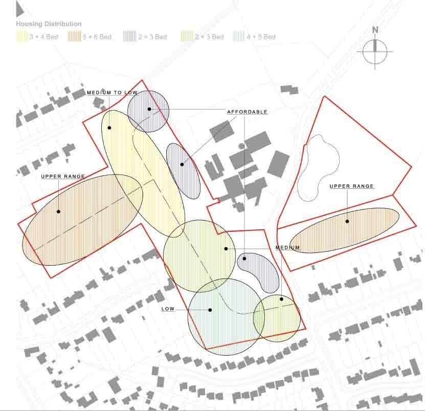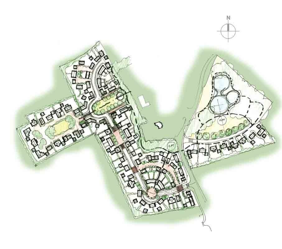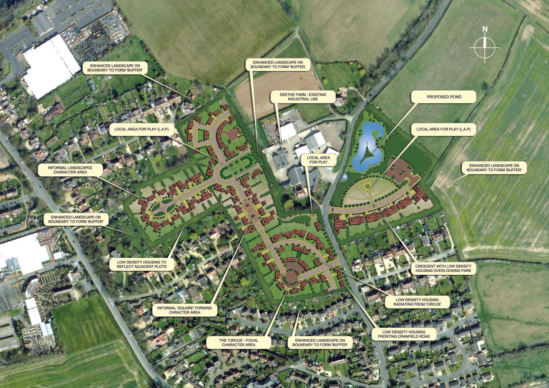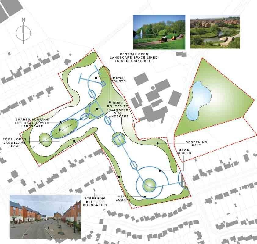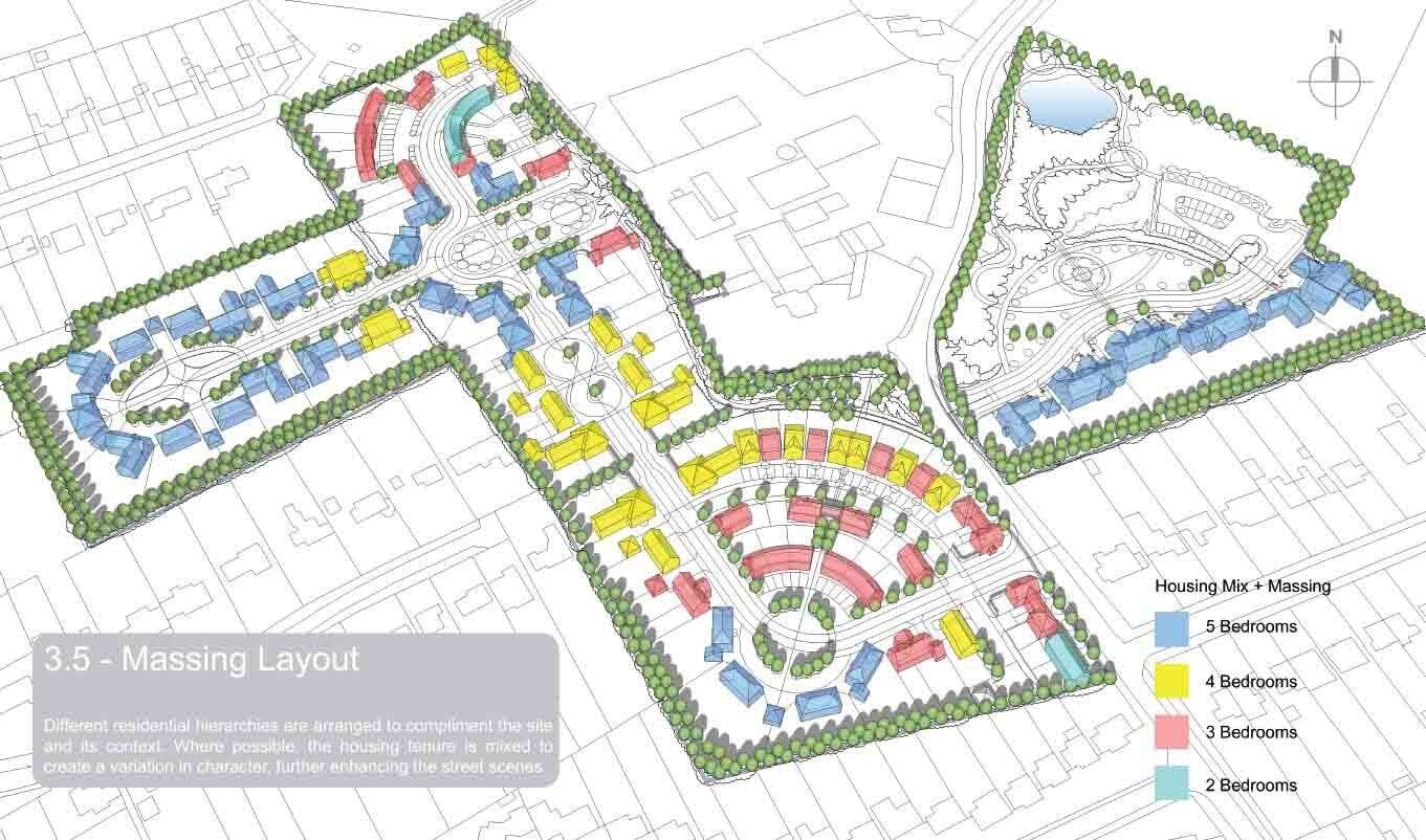 A masterplan for the development of a parcel of land to comprise a mix of dwellings, ranging from executive homes to starter homes with new access and transport infrastructure.