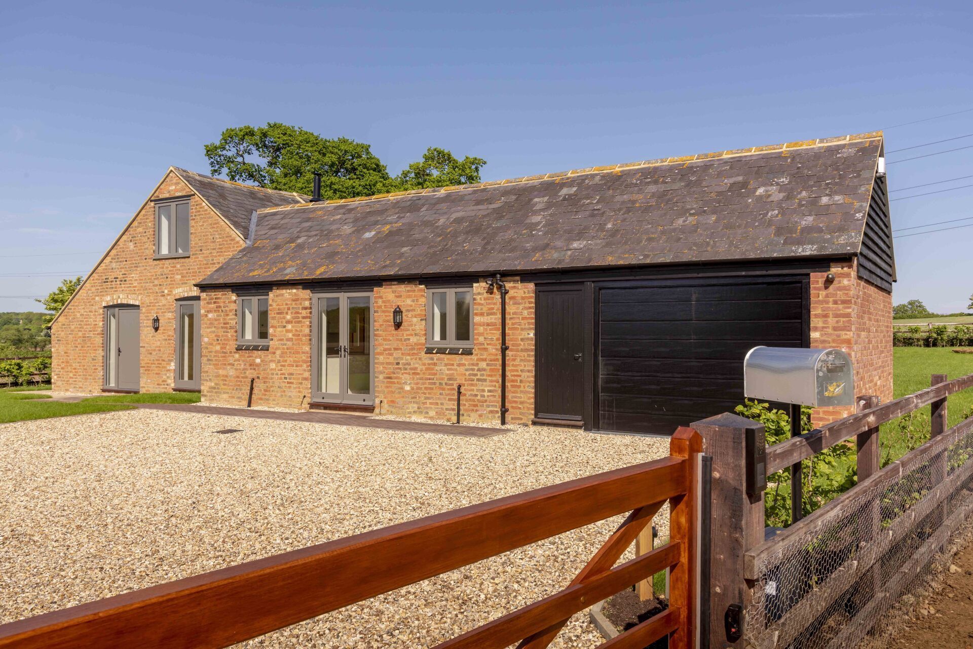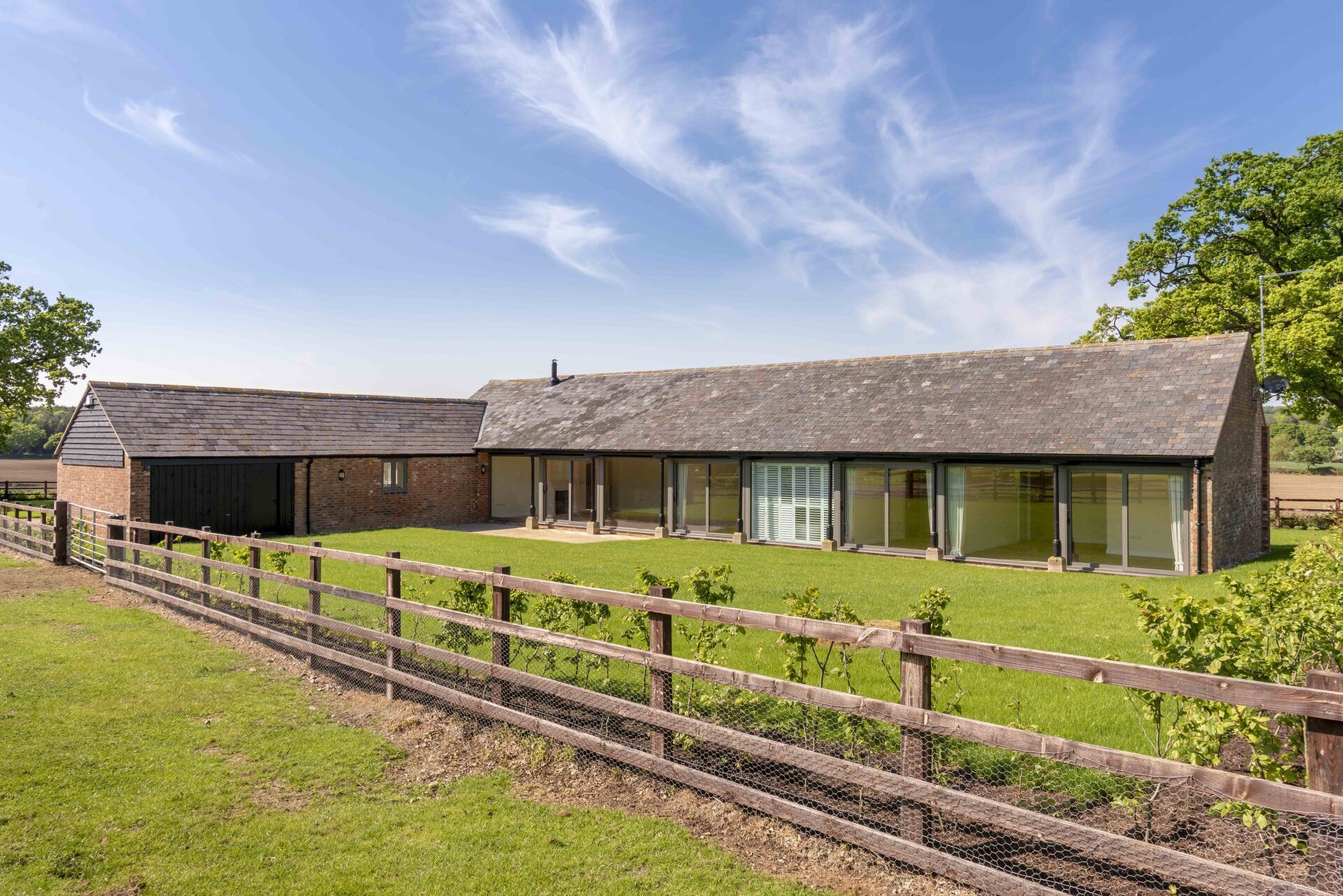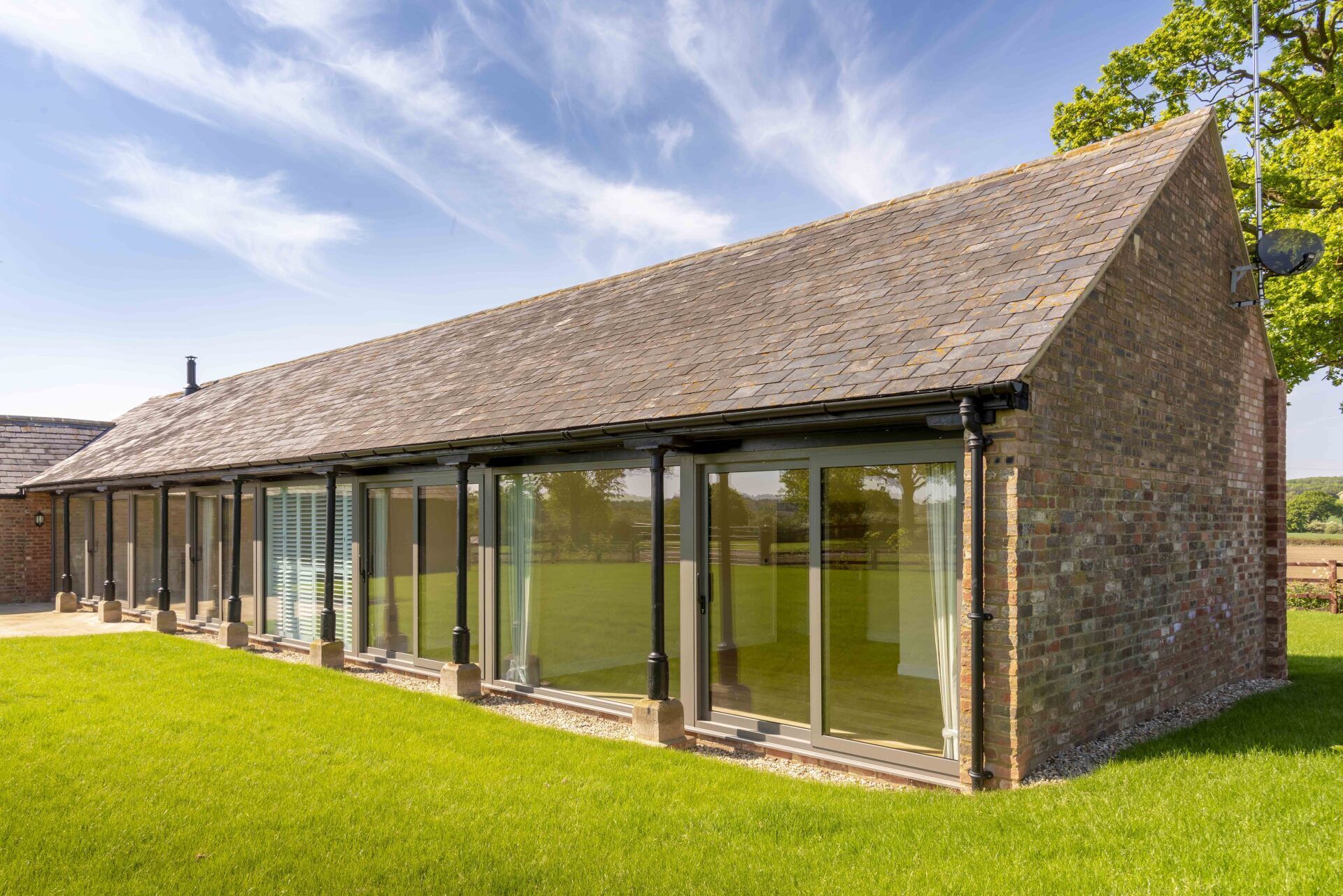 A single storey ‘L’ shaped brick barn, converted to a bright modern home through the extensive use of glass and metal clad insertions.