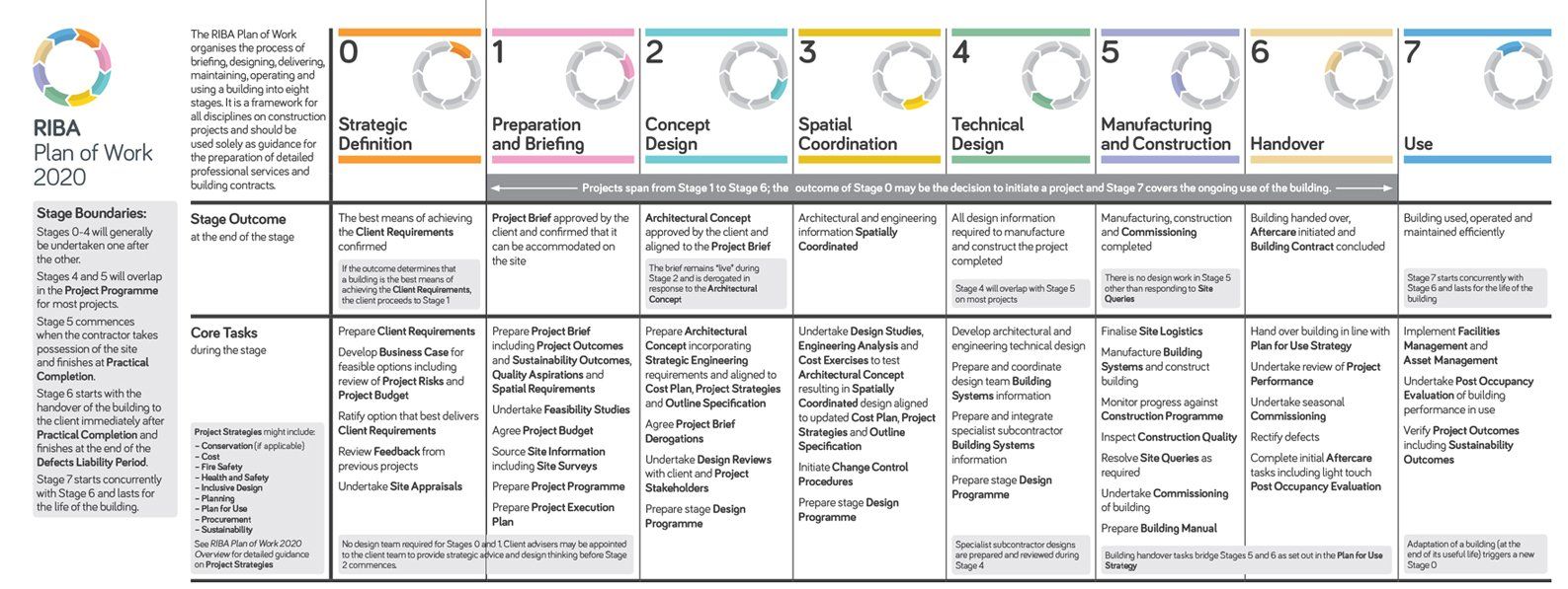 The RIBA Plan of Work organises the process of briefing, designing, constructing and operating building projects into eight stages and explains the stage outcomes, core tasks and information exchanges required at each stage.