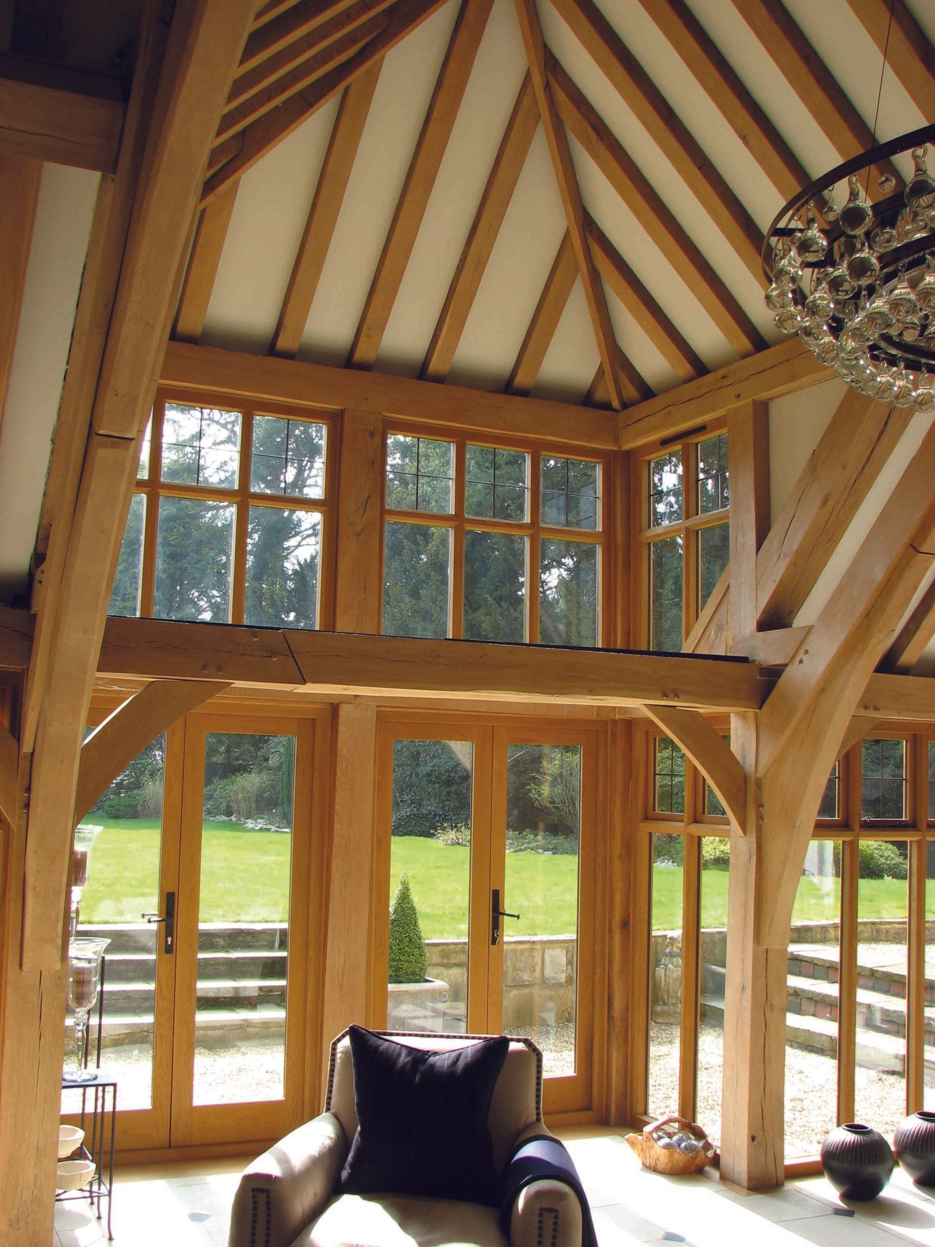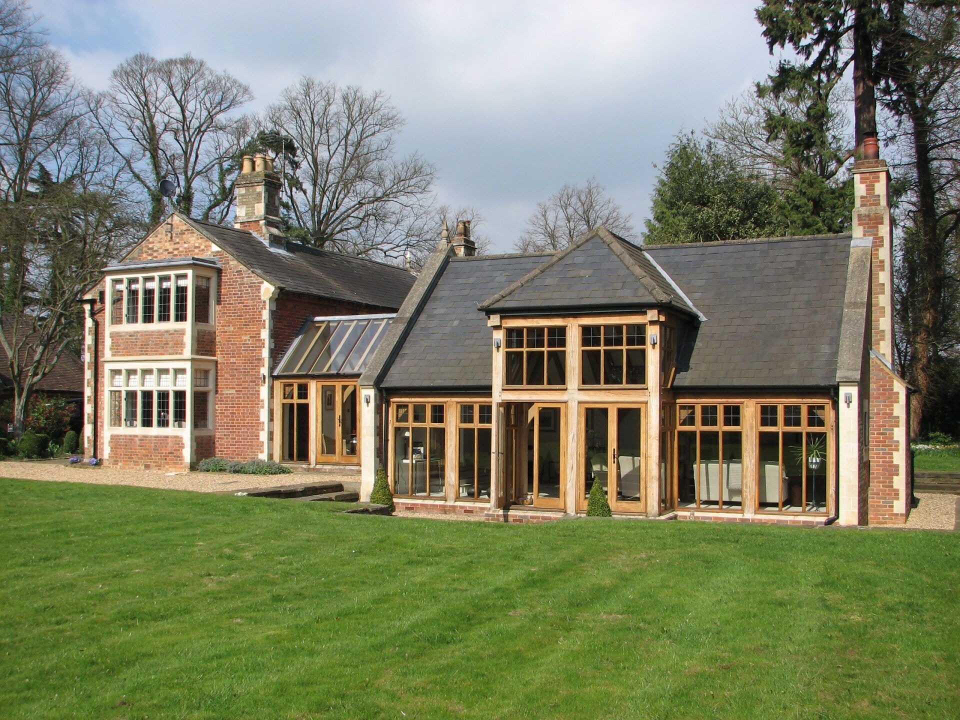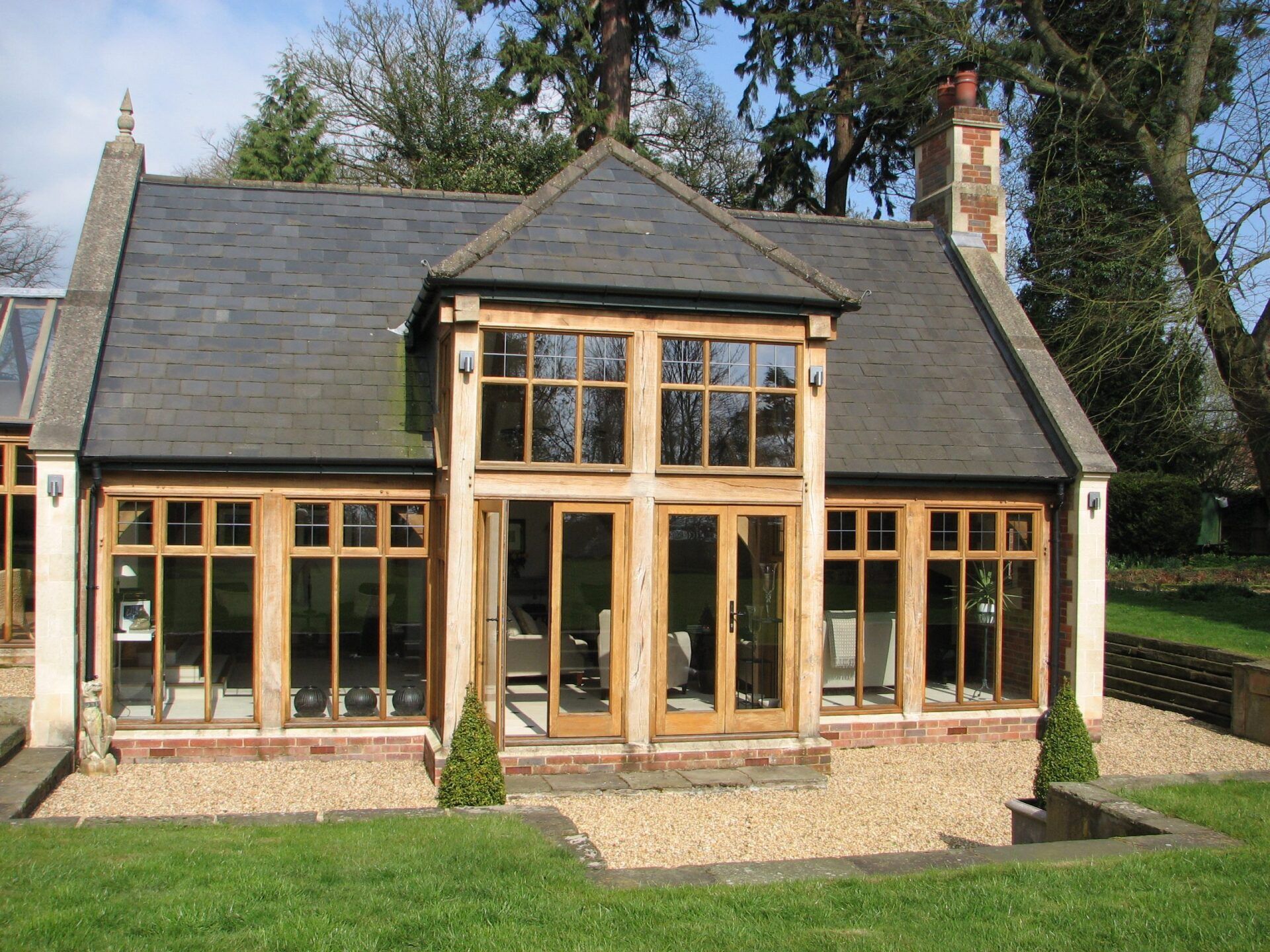 An elegant, vaulted green oak frame extension with traditionally detailed brick gables, attached to a Grade II listed game keepers’ lodge.
