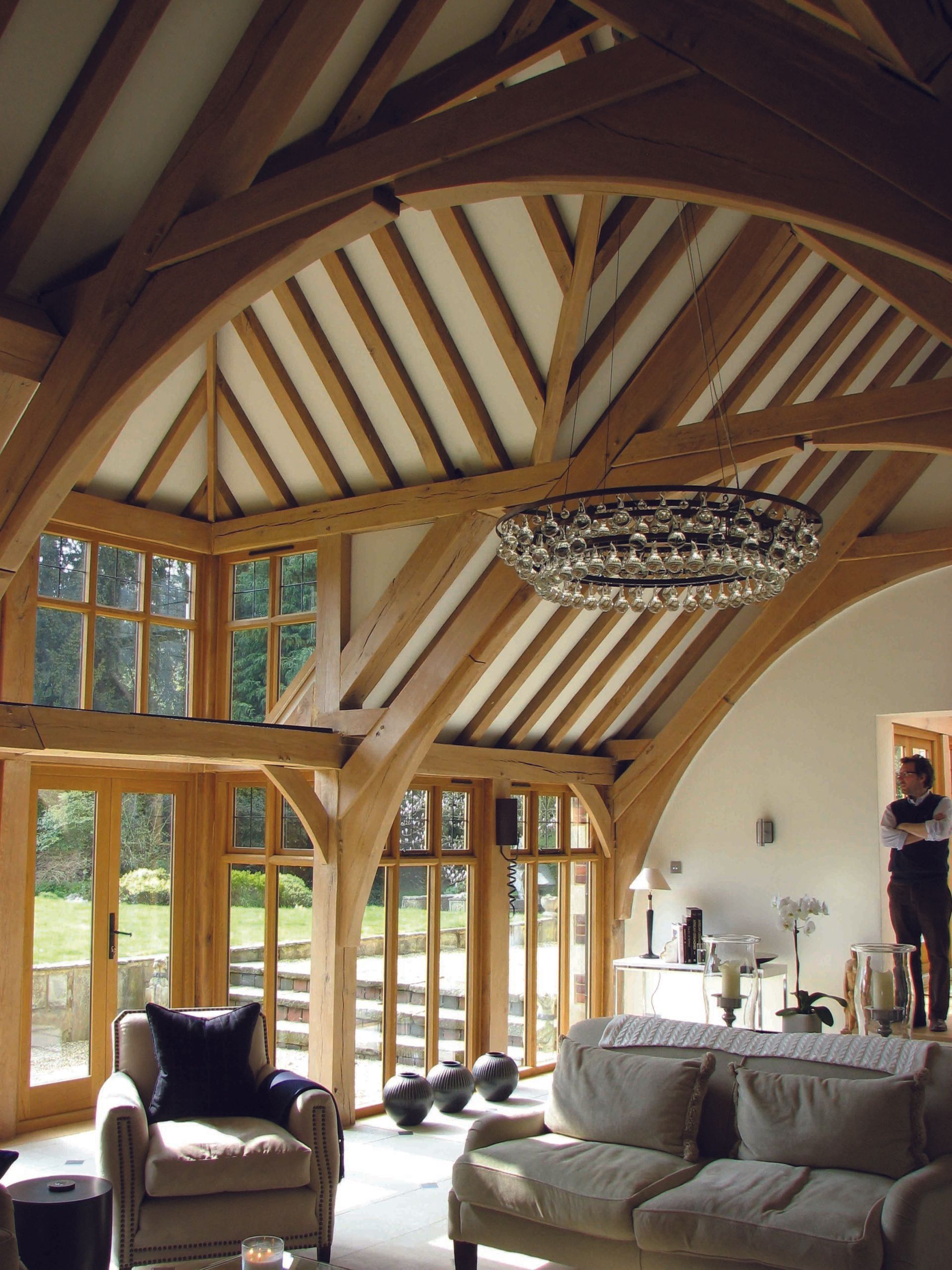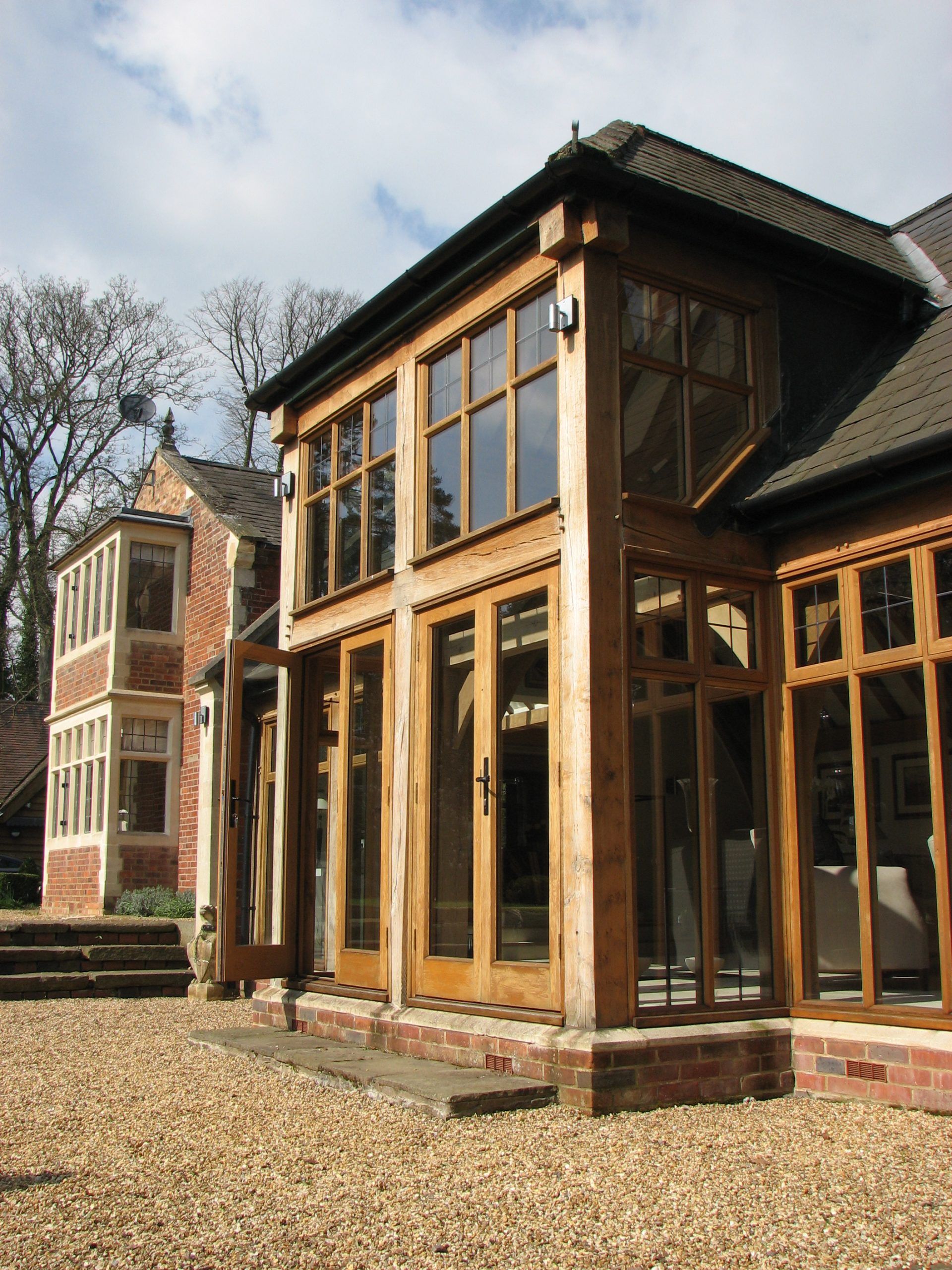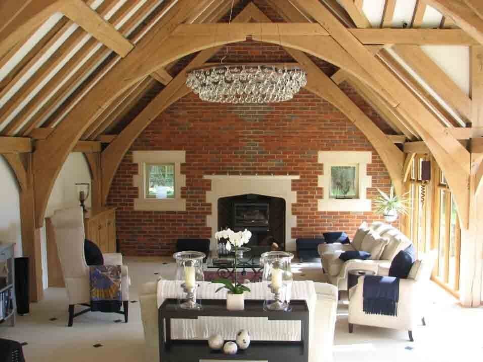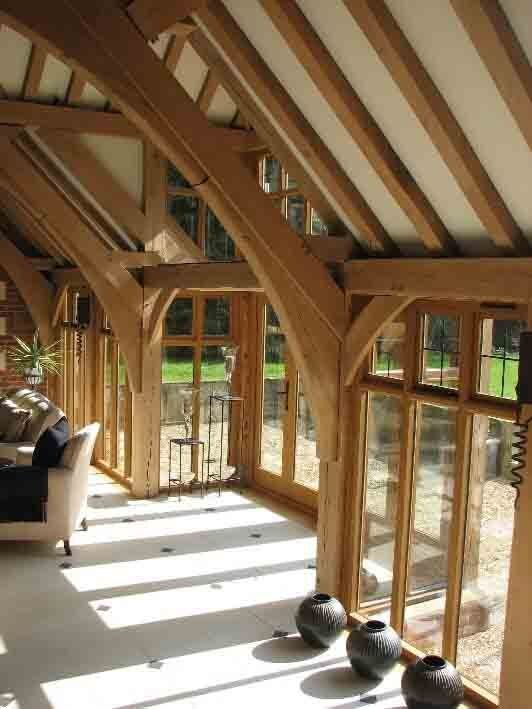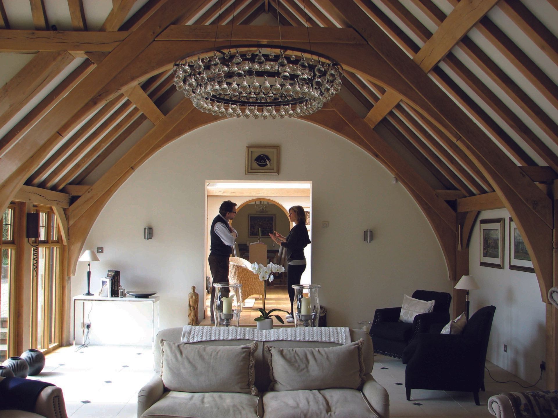 An elegant, vaulted green oak frame extension with traditionally detailed brick gables, attached to a Grade II listed game keepers’ lodge.