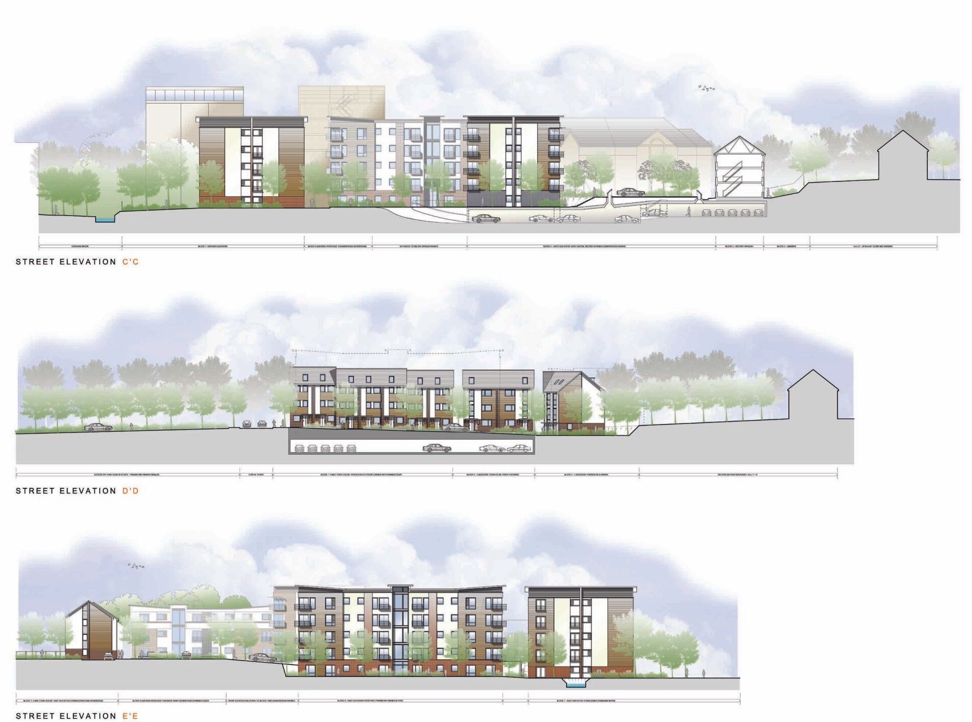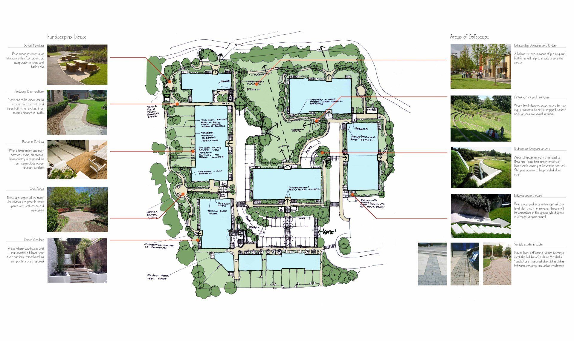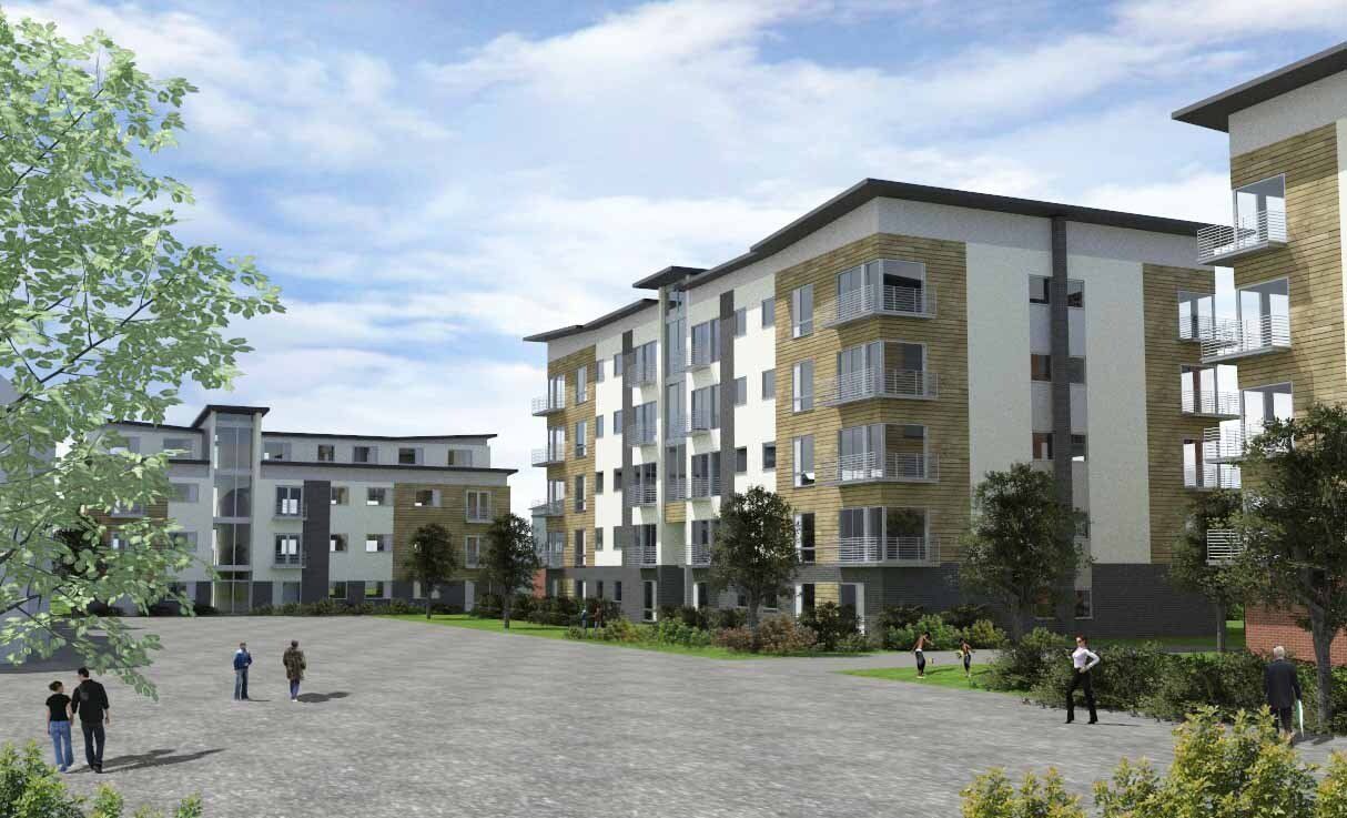 A large-scale development of apartments spread across five buildings and arranged around a shared, landscaped garden.