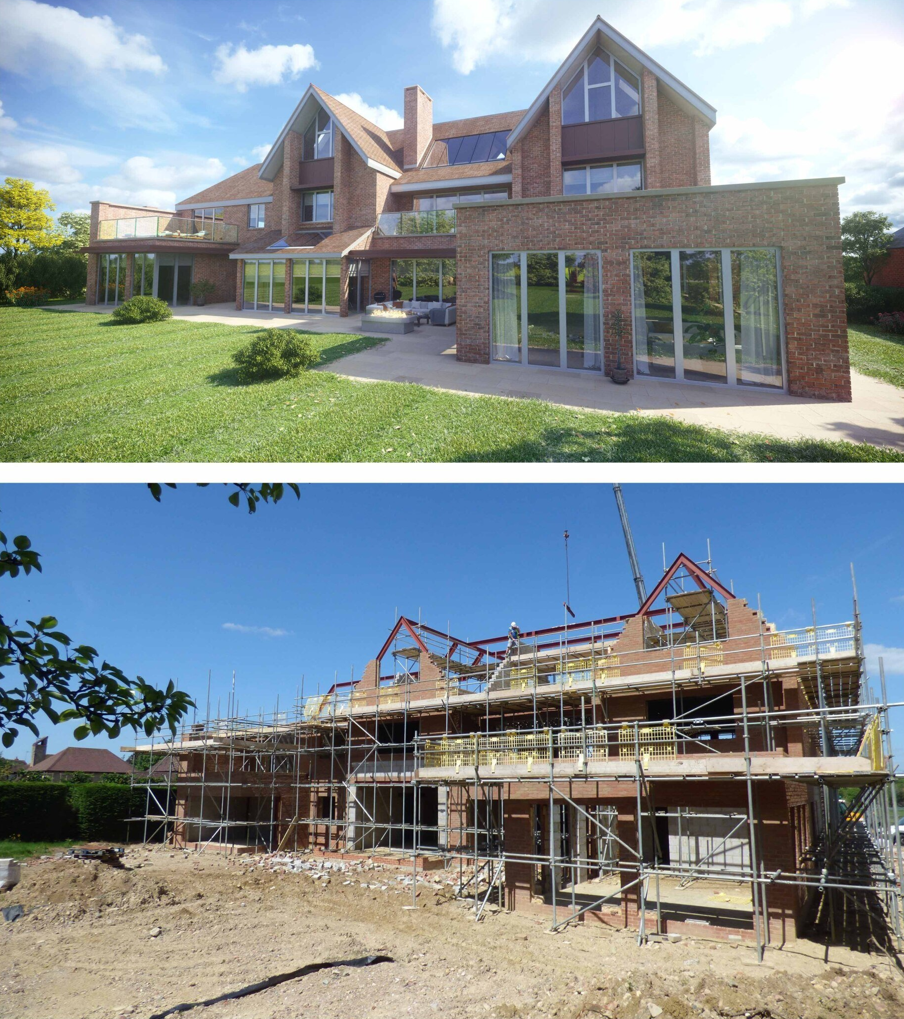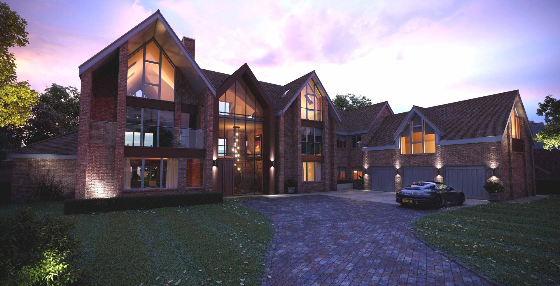 An expansive new home arranged over three storeys with a grand entrance hall, sculptural staircases, gym, and steam room, all designed with views over the neighbouring paddocks.